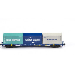 Sin stock Precio 36,00 €Modelo: Vagón plataforma portacontenedores Sgnss / MMC3E Continental Rail. -Contenedores: 20' Cosco - 20' CMA CGM - 20' China Shipping