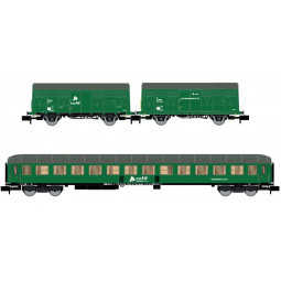 En stock Precio 62,39 € En stock Precio regular 70,90 €Modelo: Set de 3 unidades, decoración verde, compuesto de 2 vagones cerrados de 2 ejes J2 y 1 coche SSV-500 ADIF.