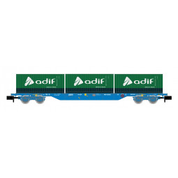 En stock Precio 44,79 € En stock Precio regular 50,90 €YA DISPONIBLE Modelo: Vagón portacontenedores 4 ejes Renfe decoración azul, con 3 contenedores de 20 pies "Adif".