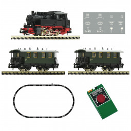 Modelo: Set de iniciación analógico: Locomotora de vapor serie 80 con un tren de pasajeros.Contenido:1 locomotora de vapor serie 802 vagones de mercancías de borde medio.1 controlador de mano electrónico1 fuente de alimentación enchufable■ Con placas de varias administraciones ferroviariasVías...