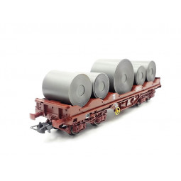 Sin stock Precio 45,00 €Modelo: Vagón bobinero RENFE, con carga de bobinas, decoración rojo oxido.
