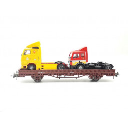 Modelo: Vagón telero con camión dresina M.B. "DB Cargo". -Cinemática corta con cajetín para cabezal enganche normalizado NEM-362. -Bolsa de accesorios.