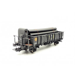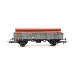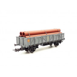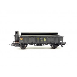 Sin stock Precio 27,90 €Modelo: Vagón bordes Altos Ekklos RENFE "T.E.", con carga de tubos. -Cinemática con cajetín normalizado NEM-362 para cabezales de enganche.