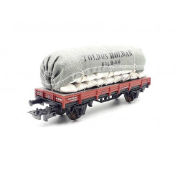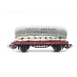 Sin stock Precio 29,90 €Modelo: Vagón plataforma 2 ejes RENFE, con sacos "Toldos Roldan". -Cinemática de enganche integral.