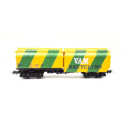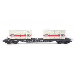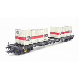 En stock Precio 118,92 € En stock Precio regular 139,90 €Modelo: Vagón plataforma portacontenedores tipo Sgs 693, con 2 contenedores de 20 " de la DB. -Chasis metal inyectado. -Nota: Con ejes de rueda DC para sistema de corriente continua.