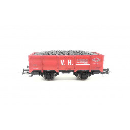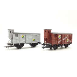 En stock Precio 79,00 €Modelo: Conjunto de 2 vagones abiertos tipo X RENFE, uno de ellos con garita, decoración "Bodegas Bilbainas" Haro Rioja. -Cinemática con cajetín normalizado NEM-362 para cabezales de enganche.