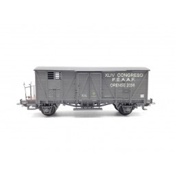 En stock Precio 92,90 €Modelo: Vagón cerrado con balconcillo "Conmemorativo para el XLIV congreso de la F.E.A.A.F. Ourense 2006. COPASA, color gris chasis y carrocería. -J-303871 RENFE -Cinemática con cajetín normalizado NEM 362 para enganches.