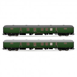 Modelo: Set de 2 coches RENFE 5000, furgón BBD4 y coche cafetería AAR, decoración verde.