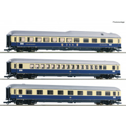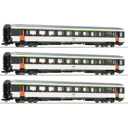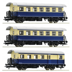 Sin stock Precio 69,90 €Modelo: Set de 3 Vagones corrugados "Spantenwagen", ÖBB. -El set está compuesto de dos vagones con ventanas superpuestas tipo Bi y un vagón con compartimiento de equipajes, tipo BD, en lacado azul/beige. -Cajetín según normativa NEM 362 y cinemática de enganche corto.