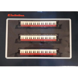 Sin stock Precio 209,90 €Modelo: Set 1 de tres coches de tren expreso para el EC "Mont Cenis" de los FFCC estatales franceses.El juego contiene tres coches de asientos abiertos "Corail" de segunda clase, tipo B10tu.■ Nuevo debajo de la carrocería con detalles finos. ■ Imitaciones auténticas de soldaduras en la carrocería...