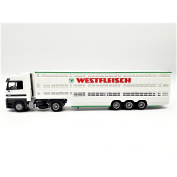 Sin stock Precio 18,70 € Sin stock Precio regular 22,00 €Modelo: Camión tractora Mercedes-Benz Actros 1857, con semirremolque transporte de ganado. -Color: Blanco logo "WESTFLEISCH" -Periodo: Año 2000
