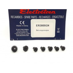 En stock Precio 8,00 €Recambio original Electrotren: Set de engranajes, para locomotora diésel 303 Renfe. -Contenido: 7 engranajes de transmisión motor a ejes. -Nota: Valido para todas las versiones del 303 de Electrotren.