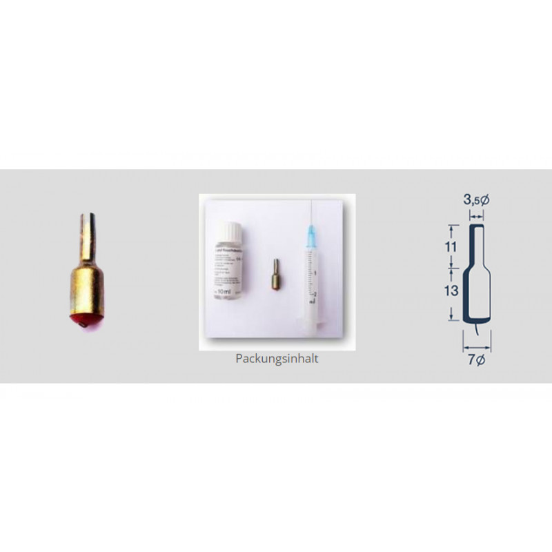 Dimensiones: 24 mm de largo x 3,5 mm de diámetro en salida, 7 mm de diámetro parte inferior.