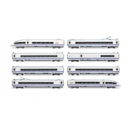 Tren de alta velocidad AVE S-103 RENFE, decoración azul/blanco original.