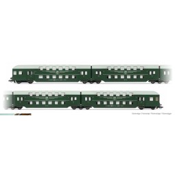 En stock Precio 100,72 € En stock Precio regular 119,90 €Modelo: Set de 4 coches de doble piso, sin coche piloto, techo verde y gris, de la DR. -Luces rojas en coches extremos según sentido de marcha, funcionamiento en DC analógico.
