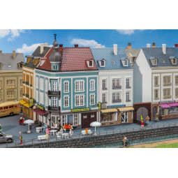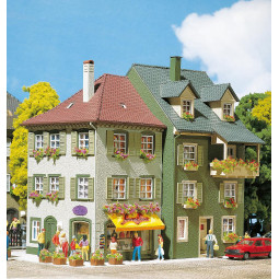 Modelo: Conjunto de 2 edificios uno en esquina y otro adosado. Contendio: Este kit de construcción contiene: 582 piezas individuales en 11 colores, piezas de ventana, 2 máscaras de papel, 2 decoraciones y 2 manuales de instrucciones de construcción. Uso para manualidades FALLER - pegamento...