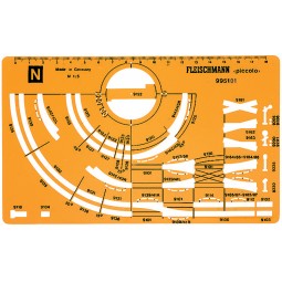 Modelo: Plantilla para planificar circuitos de vías escala N. Nota: Sirve para las vías N. Esta plantilla es de valiosa ayuda para planificar una maqueta completa. Escala de la plantilla: 1:5 respecto al tamaño de la vía original.