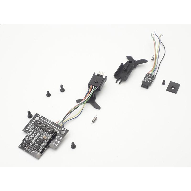 Contenido: Placa principal con conector NEM-660 para montar decoder de 21 pin, la placa lleva un falso decoder dumy para el funcionamiento en analógico, set de 2 enganches macho y hembra integrado en cinemática, 2 muelles de cinemática, tornillería y preinstalación de cableados.