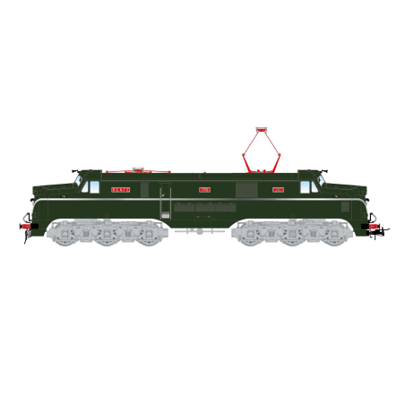 Locomotora eléctrica 7701RENFE, decoración verde oscuro-plata, sin matrícula UIC.