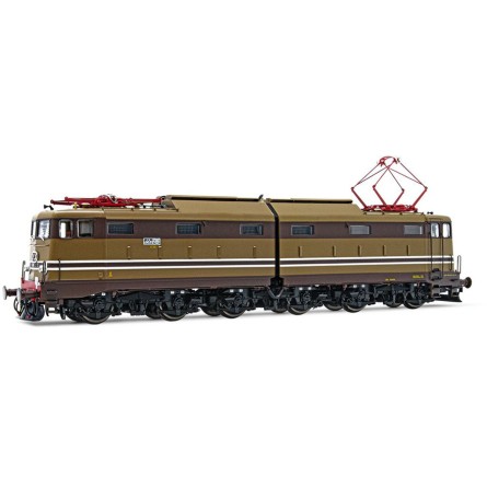 Locomotora eléctrica E645, de la FS, decoración castaño/isabella con franjas plata, bogies negros y peldaños grandes.