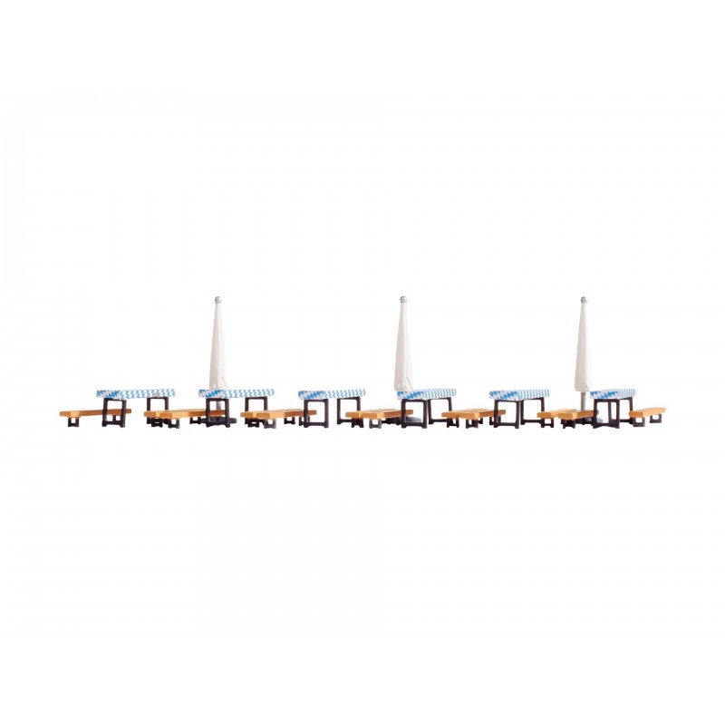 Contenido: 6 Mesas, 12 bancos y 3 sombrillas.