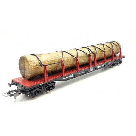 Vagón telero 4 ejes RENFE con carga tronco de madera.