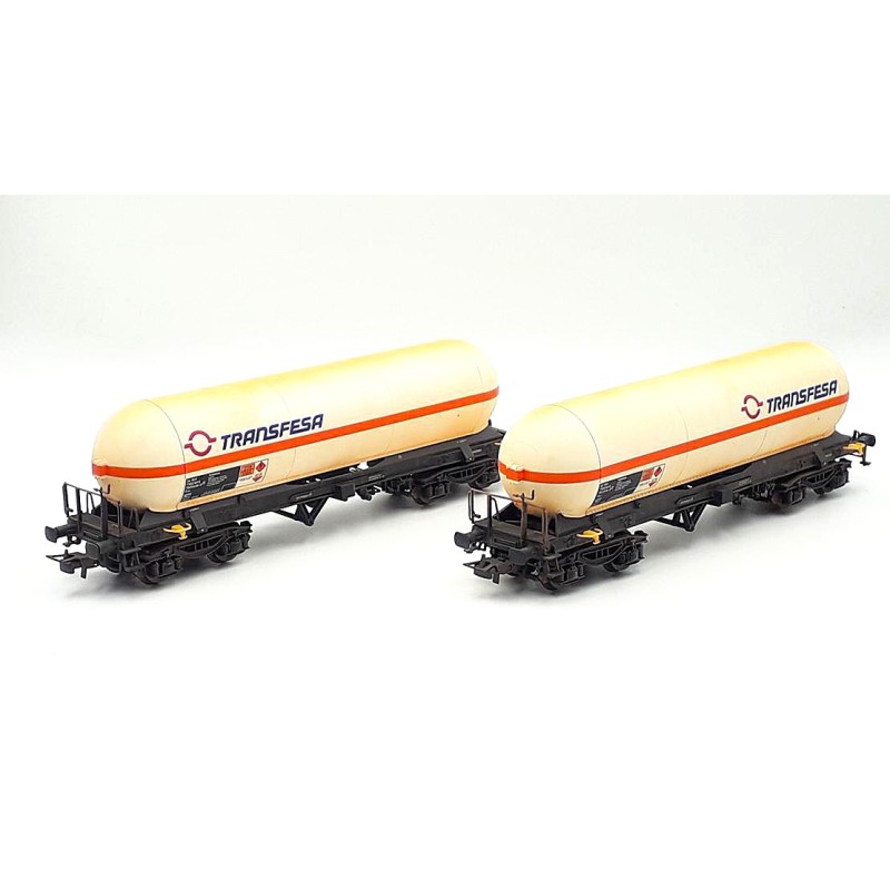 Set de 2 vagones cisterna tipo Zags RENFE, para el transporte de cloruro de vinilo, decoración Transfesa (Efecto envejecido).