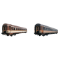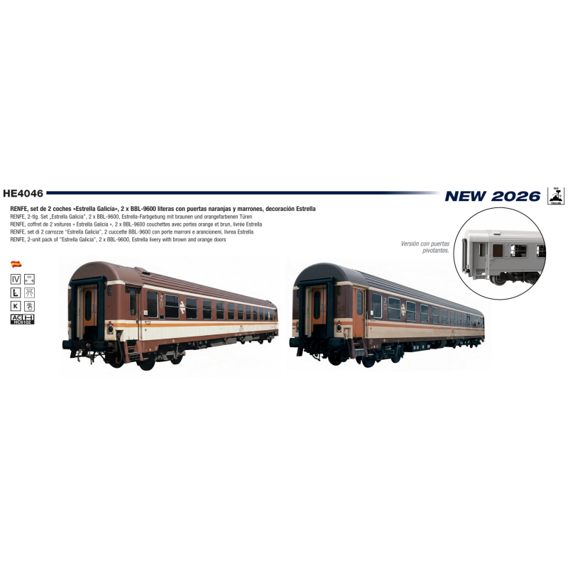 Set de 2 coches RENFE «Estrella Galicia», 2 x BBL-9600 literas con puertas naranjas y marrones, decoración Estrella.