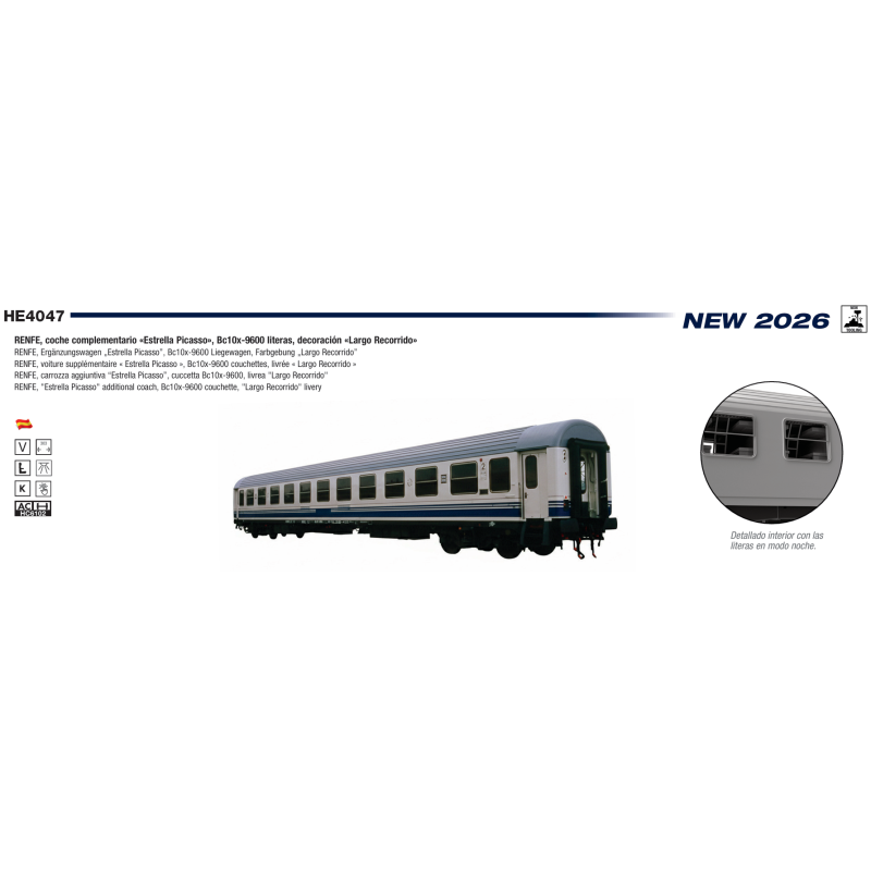 Coche complementario RENFE «Estrella Picasso», Bc10x-9600 literas, «Largo Recorrido» - ELECTROTREN - HE4047 - Escala H0.